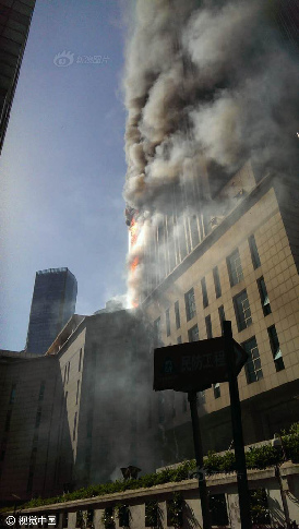 2016年05月03日,南京市新街口洪武路东侧,隆盛大厦突发大火,火势迅速从楼下向上蔓延,整栋大楼的南侧现明显火势。图片来源:视觉中国