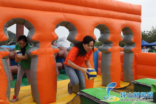第一项游戏“活力大冲关”开始了,只见从坪山办事处党群工会小组、武装综治工会小组、群团工会小组等10支队伍中选出的精干力量,抱着软质排球出发,通过障碍,时而加速快跑,时而匍匐前进,时而跨越,时而跳下。由于跨越的障碍是充气气囊,很多选手在跨越障碍时,排球掉落,只见他们迅速捡起排球继续前进,女队员通过全部障碍后将排球交付男队员,男队员继续进行大冲关。虽是第一个游戏项目,但各队队员都拿出“拼博”精神,有的队员下场后才发现刚才只顾着拼速度,竟没发现自己手臂已经擦破皮。