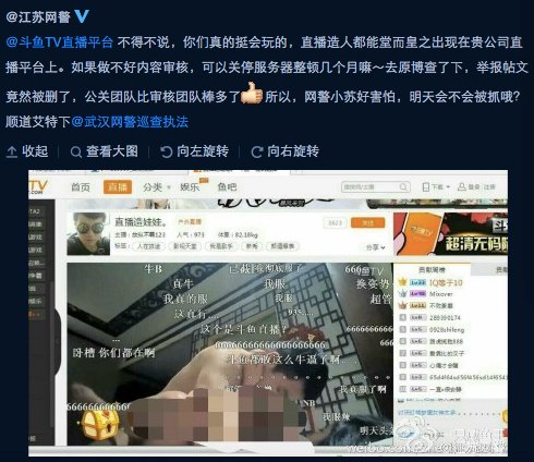 新京报快讯(记者韩雪枫)今天下午5时许,江苏省公安厅网络安全保卫总队(下称江苏网警)发微博称,网络直播平台斗鱼TV有人直播“造人”内容。江苏网警称,“你们挺会玩儿的……如果做不好内容审核,可以关停服务器整顿几个月”。