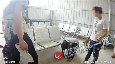 小伙穿厚长袖、运动拉链外套,跪在候车厅排凳旁边。旁边乘客有点惊奇,男儿膝下有黄金,哪能说跪就跪?只见他时而双手抱头,时而埋头在地。