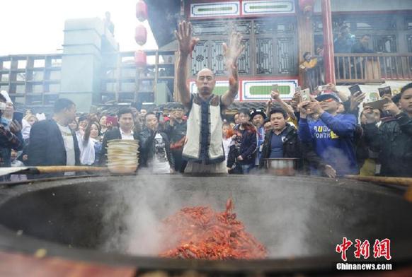 5月8日,张家界首届龙虾文化节在溪布街火宫殿举行,“鬼谷大师”唐程刚在一个直径近2米的大锅内展示徒手爆炒龙虾的绝活,吸引了众多游客的围观。现场厨师把与唐程刚配合完成的美味龙虾供给百位游客免费食用。杨华峰 摄
