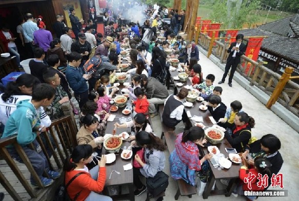 5月8日,张家界首届龙虾文化节在溪布街火宫殿举行,“鬼谷大师”唐程刚在一个直径近2米的大锅内展示徒手爆炒龙虾的绝活,吸引了众多游客的围观。现场厨师把与唐程刚配合完成的美味龙虾供给百位游客免费食用。图为百人共享龙虾宴。杨华峰 摄