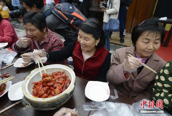 5月8日,张家界首届龙虾文化节在溪布街火宫殿举行,“鬼谷大师”唐程刚在一个直径近2米的大锅内展示徒手爆炒龙虾的绝活,吸引了众多游客的围观。现场厨师把与唐程刚配合完成的美味龙虾供给百位游客免费食用。图为妈妈们吃起了龙虾宴。杨华峰 摄