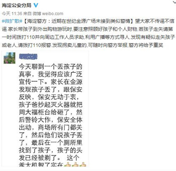 前几日北京市民的微信群中关于“孩子被偷遭剃头”的消息被热传。其内容称:“家长在金源发现孩子丢了,跟保安反映,保安无动于衷,孩子爸抄起灭火器就把某柜台给砸了,然后警铃大作,保安全体出动,商场所有门都关了,然后他们说孩子丢了,最后在一个厕所里找到了孩子,孩子的头发已经被剃了。”记者电话咨询了北京海淀区世纪金源购物中心,但该中心称没有此类事情发生。4月22日北京海淀公安局分局辟谣,称近期在世纪金源广场未接到类似警情。