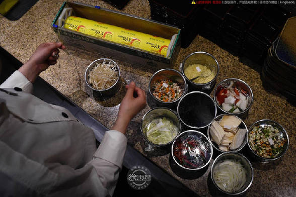 李茹芳将葱花、蒜泥等十分钟刚刚制作好的小料密封并贴好日期准备冷藏。酒店有严格的食品安全制度,为了保证小料的新鲜,这批原料会在规定时间内使用,一旦过期将全立即处理掉。