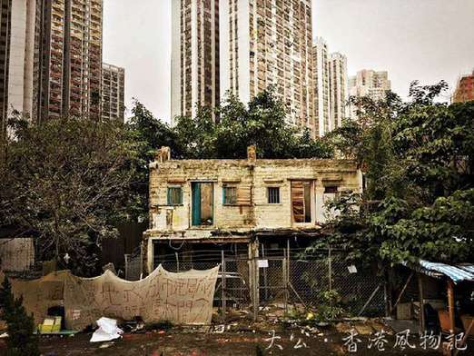 可惜的是,利益往往是推倒仁义的诱饵,本港地产商于80年代致力逐一收购村屋,一迭迭钞票摧毁着一座座百年古屋,结果围村只剩下满目疮痍,零声的丢空着一块块小空地,任由杂草丛生。肩并肩的“围墙”,就恰如六国先后遭强秦攻破一样,“盖失强援,不能独完”;主力墙在失去可靠倚傍下,结构受损而逐一倒塌。图为围村旁是高楼大厦,形成对比。