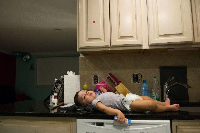 2岁的Matheus Dasilva在凌晨5点醒来,她要被送到保姆家,然后等待他的妈妈Doris DeLeon下午5点下班回来接她。
