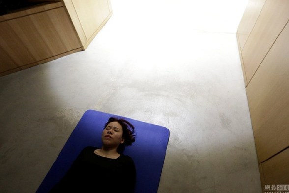 代翔说:“对于科技,更多用的是大脑,员工需要时间找到灵感。我们的休息区不只是晚上休息的地方,中午也可以。”图为4月26日,北京,代翔的员工张坤午饭前在办公室练习瑜伽。Jason Lee/视觉中国