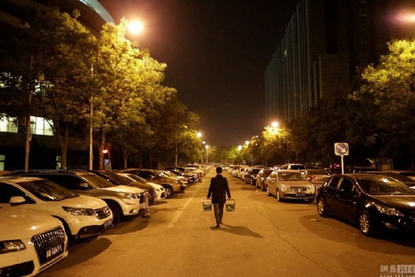 图为4月27日,北京,午夜过后,某信用管理公司人事经理韩立群拿着啤酒和宵夜走向办公室,和同事们分享。Jason Lee/视觉中国