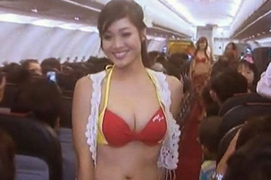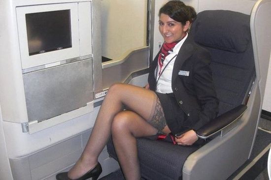 在这组照片中,一名俄罗斯空姐秀出了自己的乳沟,而另一名俄罗斯空姐则避开乘客撩起裙边,露出了自己的丝袜花边,更有甚者在男乘客面前露出丁字内裤。