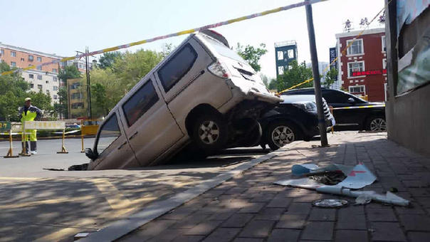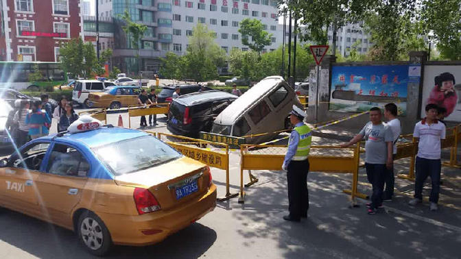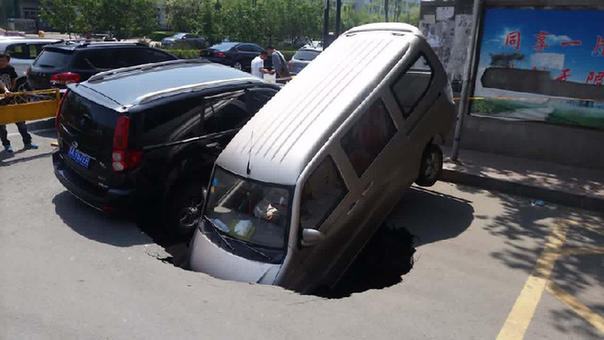 图为路面突现10平方米“天坑”,两车“栽跟头”