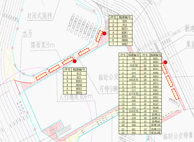 1.梅林关改造施工期间,进关方向原始发场站因施工围挡暂时停用,原进关方向的部分始发线路临时调整至周边场站发车,原上落客位置调整为进关方向调头车道内;进关方向途经线路原停靠站点位置不变, 但站台数量由原来7个被压缩为了4个。出关方向原始发站台因施工围挡暂时停用,原上落客位置调整为出关方向调头车道内;出关方向途经线路停靠站迁移至废弃收费站旁。