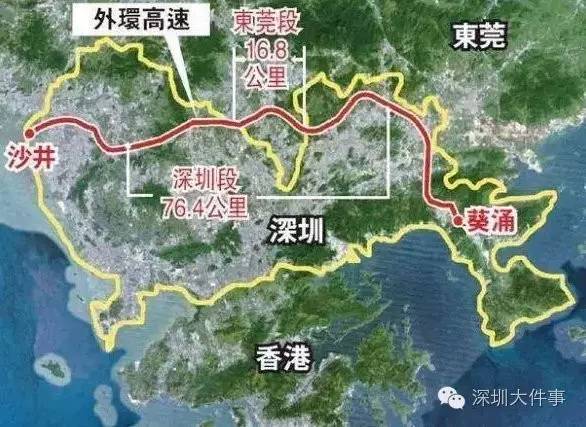 ▲在深中通道前,深圳还有一项工程:外环高速,全长92公里,预计2019年可通车,将与沿江、广深、南光、龙大、梅观、清平、博深、深惠、深汕、盐坝、东莞等11条高速相接。