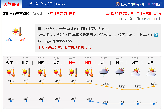 深圳新闻网讯 今天是24节气中的“夏至”,意味着炎热天气的正式开始。记者获悉,接下来一周的天气主格调仍是晴热。20日,全市约50%(50个)的自动气象站最高气温达到34-35℃,大学城站记录到全市最高气温36.1℃。市气象台在20日7:30发布了高温黄色预警,是今年首个高温预警信号。