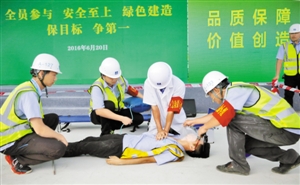 昨日,由深圳地铁集团主办、中国建筑股份有限公司承办的大型“安全生产月”系列活动在6号线6103标段长圳车辆段举行。 图为现场演练安全应急救护。 深圳商报记者 施平 摄