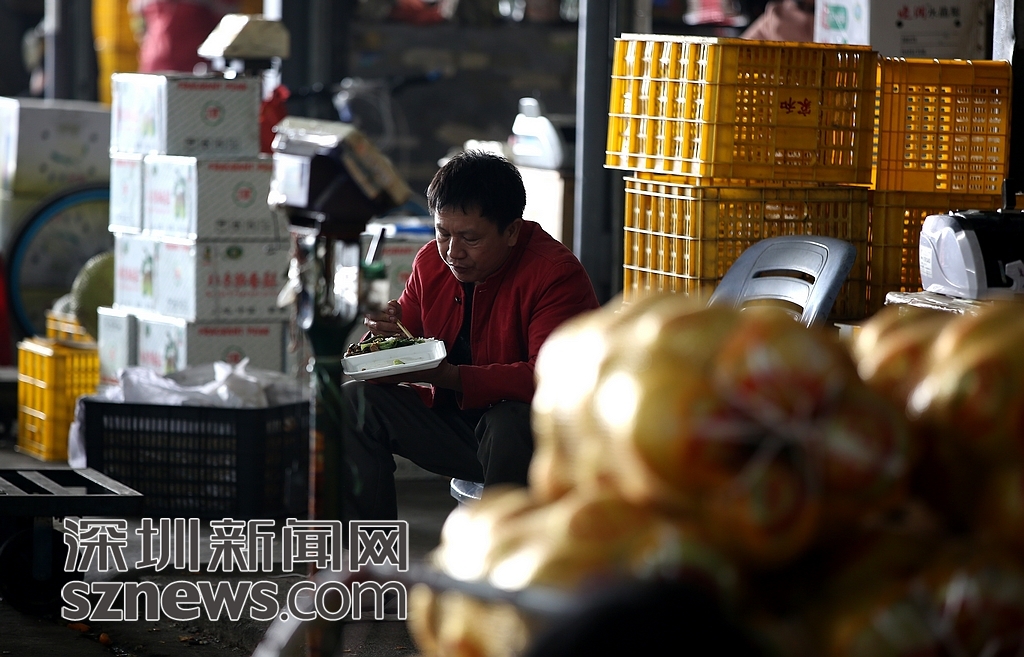 火灾没有影响到生意的正常进行,没有遭受影响的水果摊主在吃中饭。