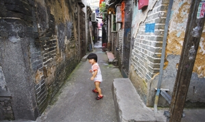 湖贝的张氏族人大多已不住在旧村。图为小孩子在狭窄的巷道玩耍。薛云麾 摄