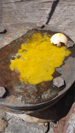而另一位女同学的煎蛋过程则显得有点污,看图之前还得自带"去污粉"。该同学坦言,为了达到立竿见影的效果,自己选择了楼顶的一块铁板作为实验基地。一番精心准备之后,鸡蛋铺好了。然而这颗蛋"太没节操了",蛋黄都散了,铺了半块铁板,形象实在欠佳。2点20分,蛋铺好,蛋黄散得略恶心。