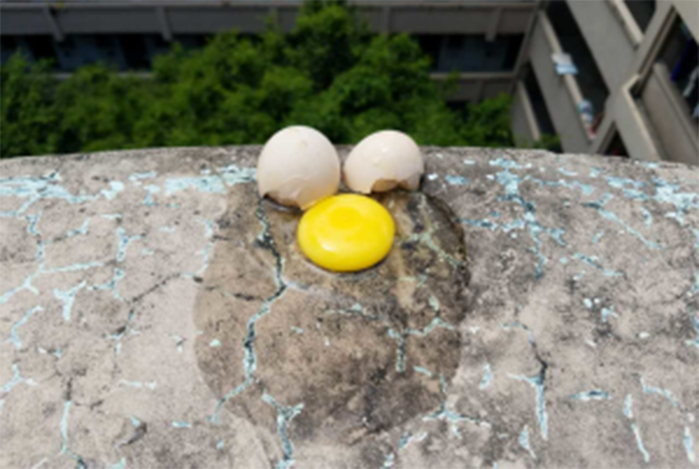 视频显示,男子选择了自家的阳台,并贡献出一枚漂亮的鸡蛋作为实验用品。"啪"地一声,蛋壳破碎,圆圆的蛋黄混着透明的蛋清流出,煎蛋之旅开始了。图为15分钟后,从外观上看,鸡蛋没有什么太大的变化。