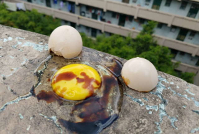 45分钟后,鸡蛋还是没有什么太大的变化,不甘寂寞的小伙子又给鸡蛋撒上了酱油。50分钟后,鸡蛋依然倔强地保持着原来的造型。一怒之下,小伙子拿起蛋壳辣手摧"蛋",没想到,蛋黄已经不是原来那个蛋黄了——它已经凝固了,再也戳不动了!换句话说,蛋熟了!实验还算成功,快被晒晕的小伙最后终于还是打消了吃煎蛋的念头。理由是:天气太热,没胃口。