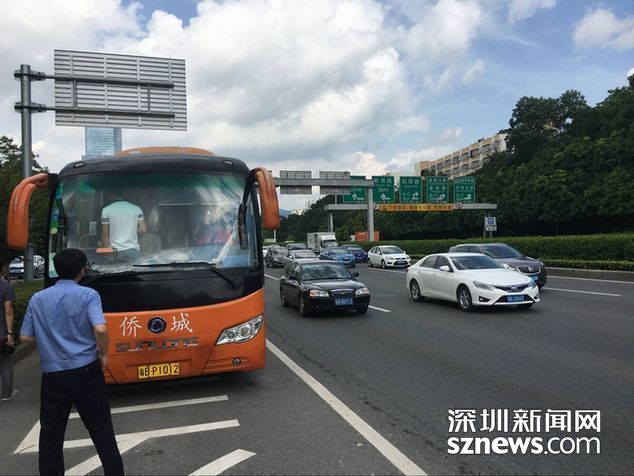 【直播君】:在北环路上,深圳交警拦下一辆大巴车。车上人员除司机外均无系安全带。深圳交警警告车上人员上路需系安全带。