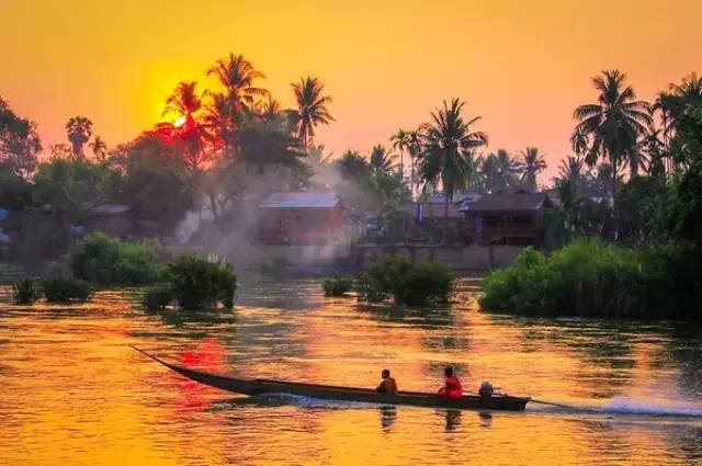 傍晚的湄公河,驳船驶在河面上,宛如一幅画~