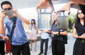 大沙河口工作人员展示未经处理和经过处理过的河水对比。深圳晚报记者 陈玉 摄