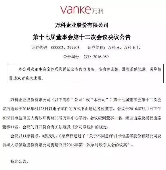 就在万科复牌前夜,7月3日晚间,万科突发公告称,该公司董事会全票通过了“关于不同意深圳市钜盛华股份有限公司及前海人寿保险股份有限公司提请召开2016年第二次临时股东大会的议案”。