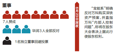 6月30日,华润集团发表声明称,对于公告中罢免所有万科董事、监事的提案有异议。当天,“宝能系”在回复深交所的问询函中称,罢免本届董事会的议案并未触及公司总裁、副总裁等职务,没有改变万科内部的管理结构和万科的经营管理职位,这并不会必然导致公司核心管理团队的更换,“宝能系”强调,提出罢免议案是“对事不对人”。