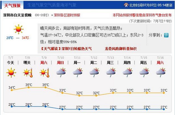 深圳新闻网讯 昨日,几场阵雨似乎驱走了炎热,但7月的天就像小孩的脸,说变就变,还没好好享受凉爽,记者从气象部门获悉,7日起,受台风外围下沉气流影响,深圳将再次启动“烧烤”模式,天气转炎热到酷热,最高气温将有35-36℃。这就是7月,伙伴们只能接受现实,想点儿避暑高招吧。