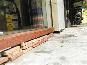 创业花园13栋一楼的一家便利店门前,墙脚的地基下沉,裂缝深度达10厘米。店家在下方足足垫起了两三层红砖,才勉强将裂缝塞满。