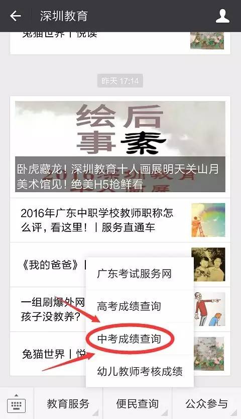 一、7月10日中午11:00开始,登录深圳教育微信公众号,在服务栏“便民查询”中点击“查询中考成绩”即可查询考试成绩。