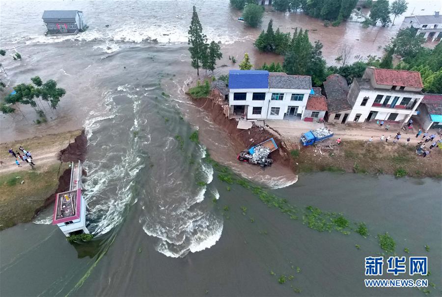 7月10日,载满麻石的卡车冲入溃口。当日上午,湖南省华容县新华垸发生重大管涌险情,10时57分出现溃口。在抢险救援中,出现了一种惊心动魄的方式:身系安全绳的抢险人员驾驶着载满麻石的卡车驶向溃口,在卡车坠入溃口前跳下卡车,用连车带石的方式堵溃口。目前抢险救援工作仍在进行中。新华社记者李尕摄