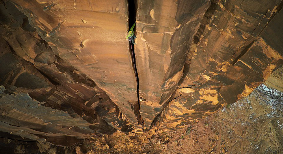 体育冒险类冠军:攀登者在美国犹他州莫泊峡谷120米处攀爬。摄影:Max Seigal(网页截图)