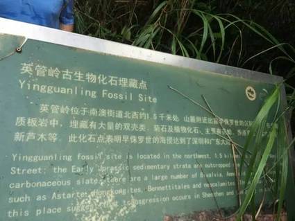 在大鹏南澳水头沙附近,只见山脉绵延,山间岩石层级分明,呈水平分布状,灌木植被稀疏分布。山脚下,草木茂盛。段维指着近在咫尺的山脉说,“深圳第一花”等早侏罗纪植物化石便发现于此。只见路边植被掩映处的一块绿色标志牌,上标“英管岭古生物化石埋藏点”,“英管岭位于南澳街道北西约1.5千米处,山麓附近出露早侏罗纪的沉积岩,在炭质板岩中,埋藏有大量的双壳类、菊石及植物化石,主要有花蛤、香港菊石、本内苏铁、新芦木等。此化石点表明早侏罗世的海侵达到了深圳和广东大陆。”