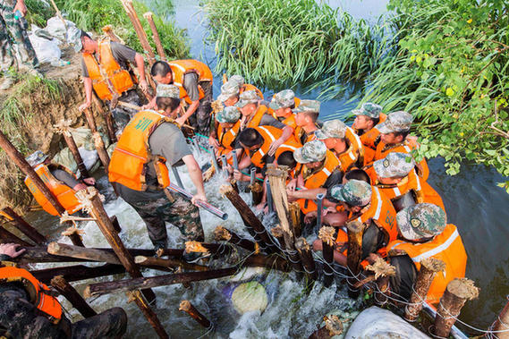 7月12日10时,江西九江,鄱阳湖东风联圩附近一内河发生4米长决口,第1集团军某旅近百名官兵第一时间奔赴救援。抵达现场后,该旅副参谋长林振明带头跳入水中,探查决口情况:决口处大量稻田被淹没,积水已没过胸口。视觉中国