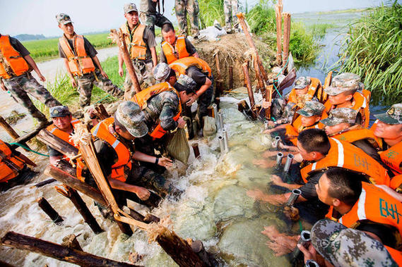 在南京高淳水阳江堤坝上记者看到,从7月3日下午16:00开始,近300名官兵抵达,直至晚上22:00,连续奋战6小时,成功加固堤坝,搬运土方1030立方米。