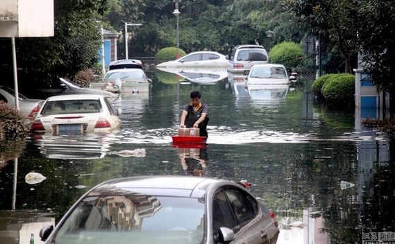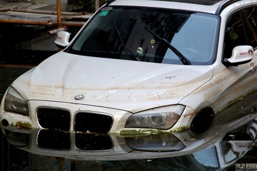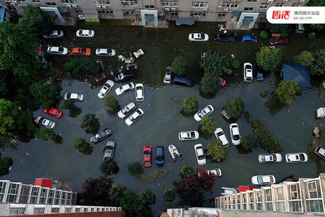 2016年7月12日,武汉大雨过后,渍水严重的南湖雅园内大量汽车被淹。