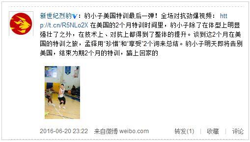 “在美国的2个月特训时间里,豹小子除了在体型上明显强壮了之外,在技术上、对抗上都得到了整体的提升。谈到这2个月在美国的特训之旅,孟铎用“珍惜”和“享受”2个词来总结。豹小子明天即将告别美国,结束为期2个月的特训,踏上回家的旅程!回来后,豹小子将就地休整,下周正式大集合开始正式的训练,冲刺新赛季!”深圳男篮官方微博对球队的美国特训做了总结。