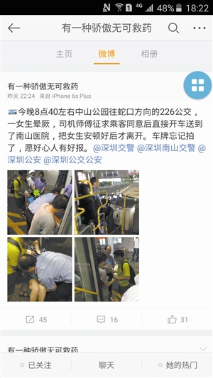 深圳新闻网讯 公交地铁等公共交通是都市居民生活中不可或缺的一环,在繁忙的地铁和拥挤的公交车上,每天都上演着无数的人情冷暖——7月13日,在深圳巴士集团226路公交车上就发生了这样一件虽然“违反”了按既定路线行驶规定,却让人交口称赞的事情,甚至深圳交警官微还称赞这是“深圳的温度”!