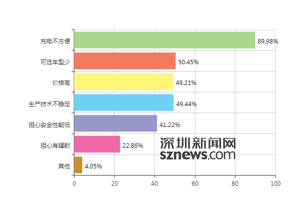 调查显示,充电不方便(89/98%),仍然是制约消费者选择纯电动车的最大因素。网民详细列出他们对纯电动车的顾虑,包括充电一次可行驶的里程短,不适合开长途,技术不成熟等。