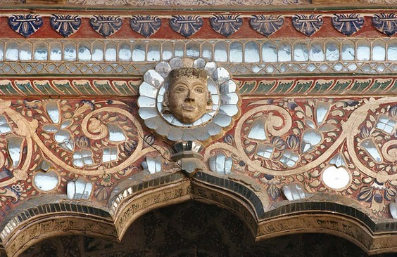 这张照片凸显了谢卡瓦蒂地区豪宅奢华的室内设计。这栋豪宅中装饰着复杂的鸟类和树木图案。