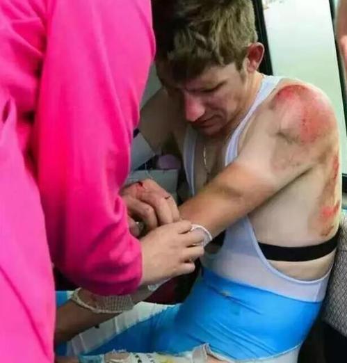 环青海湖自行车国际比赛中,在距终点2公里左右处,一位行人突然横向冲到比赛选手车队中,造成了大规模的摔车事件。