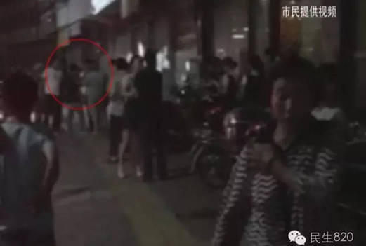 在不远处,隐约可以看到,有一群男子正对着一男子叫骂,这名穿白色衣服的男子还不时地推打着这名穿短裤的男子。