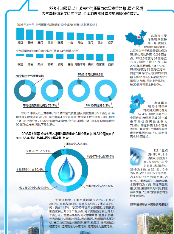 7月17日,环境保护部发布了《2016年上半年全国空气和地表水环境质量状况》。数据显示,338个地级及以上城市空气质量总体呈改善趋势。在公布的全国空气质量相对较好的十大城市中,深圳位列第四,较此前公布的《2015年中国环境状况公报》的排名上升了3位。