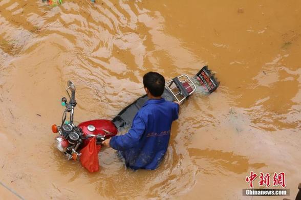 一名男子在费力推动被洪水淹没的摩托车。 李建平 摄