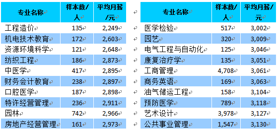 平均初次就业薪酬最低的专业是工程造价,为2249元/月;其次是 机电技术教育,为2603元/月。
