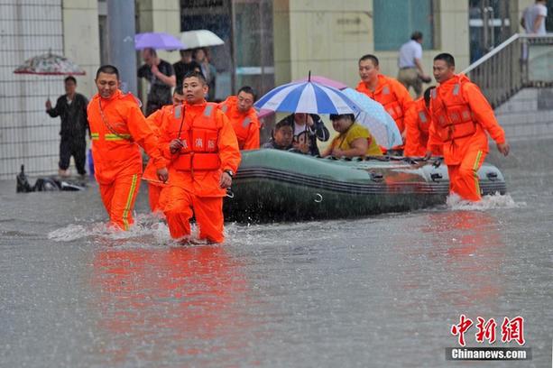 7月19日,山西太原遭遇强降雨天气,城市多处路段内涝严重,消防官兵启动皮艇救援被困民众。当日9时28分,山西省太原市气象台将暴雨黄色预警信号提升为暴雨橙色预警信号。预警区域中,部分乡镇过去3小时降水量已达50mm以上,且降水仍将持续。中新社记者韦亮 摄