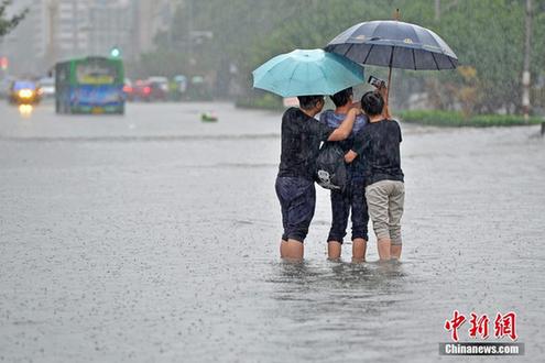 7月19日,山西太原遭遇强降雨天气,城市多处路段内涝严重,民众在积水中自拍留影。当日9时28分,山西省太原市气象台将暴雨黄色预警信号提升为暴雨橙色预警信号。预警区域中,部分乡镇过去3小时降水量已达50mm以上,且降水仍将持续。中新社记者韦亮 摄