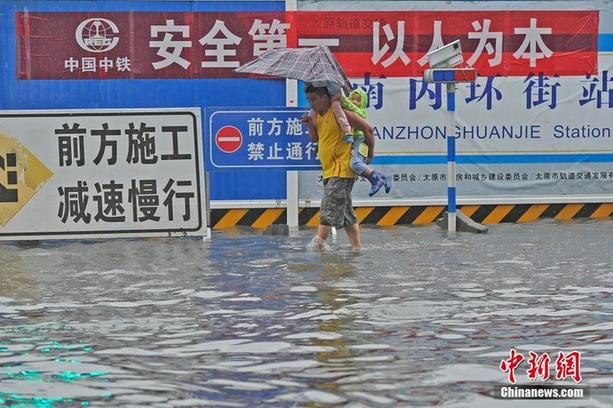 7月19日,山西太原遭遇强降雨天气,城市多处路段内涝严重,民众出行受阻。当日9时28分,山西省太原市气象台将暴雨黄色预警信号提升为暴雨橙色预警信号。预警区域中,部分乡镇过去3小时降水量已达50mm以上,且降水仍将持续。图为市民淌水前行。韦亮摄